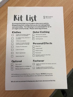 Below is a picture of the recommended kit list issued for the P7 residential trip to Alltnacriche.